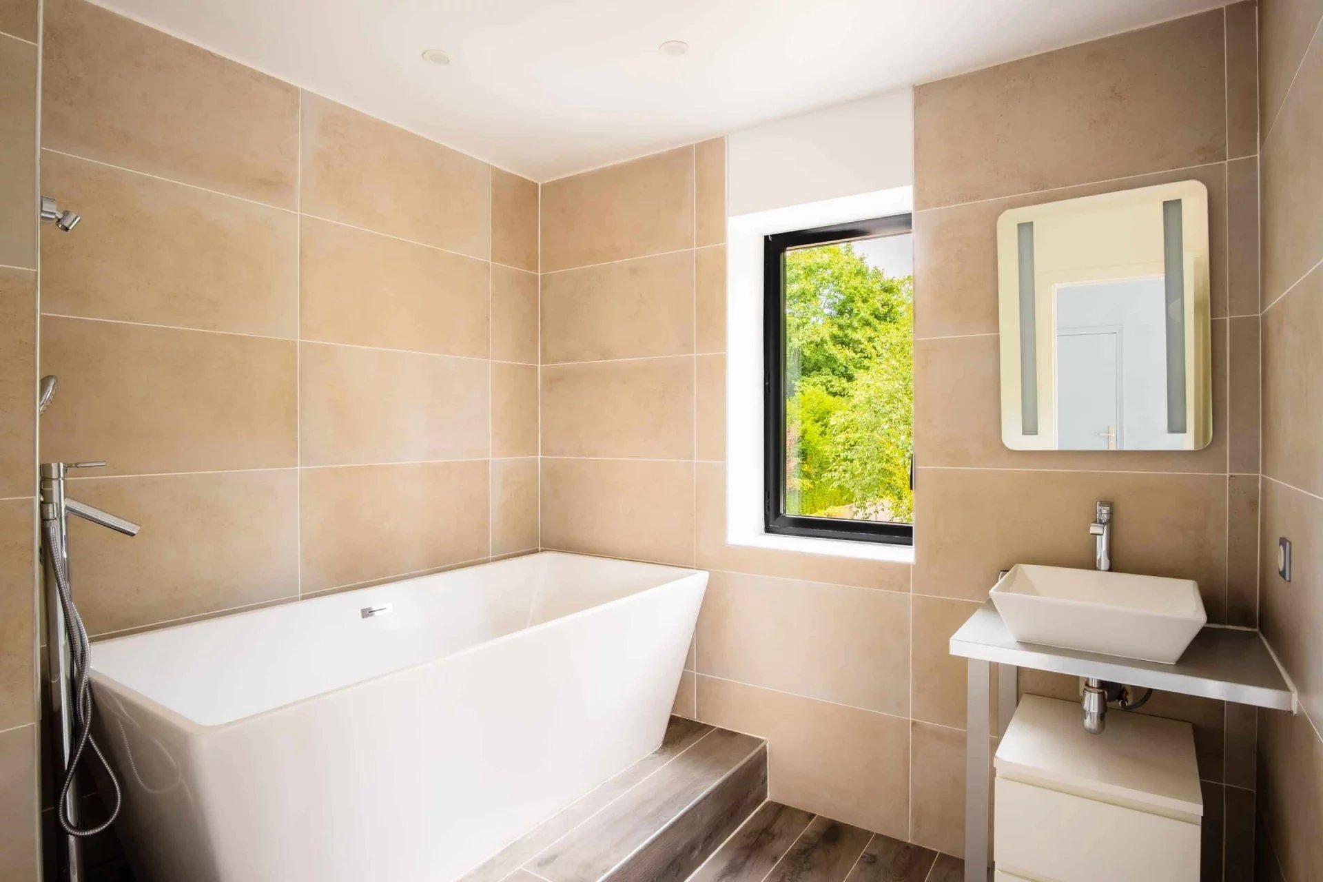 On the ground floor, you will find a luminous double living area, an elegant dining space for 10 guests, a guest toilet, and a master suite with a king-size bed (180 x 200 cm), a private bathroom with bathtub and separate shower, and en-suite toilet.