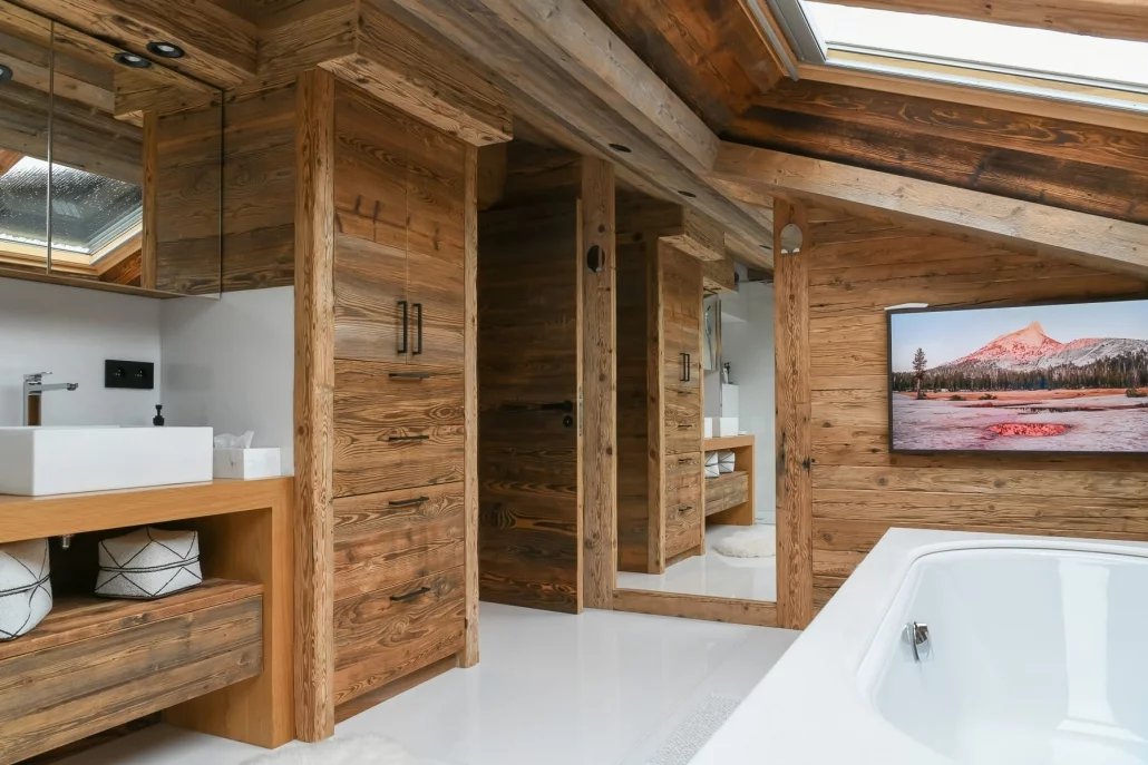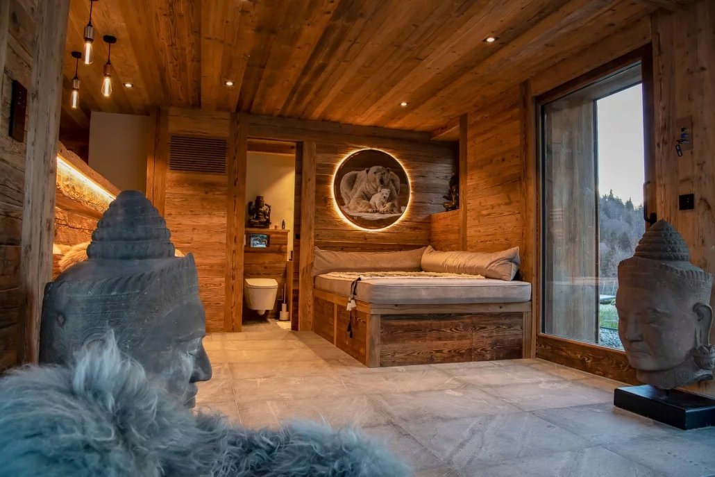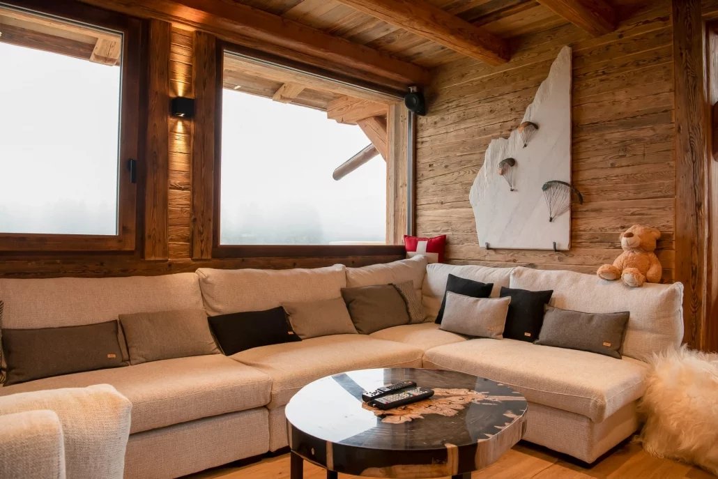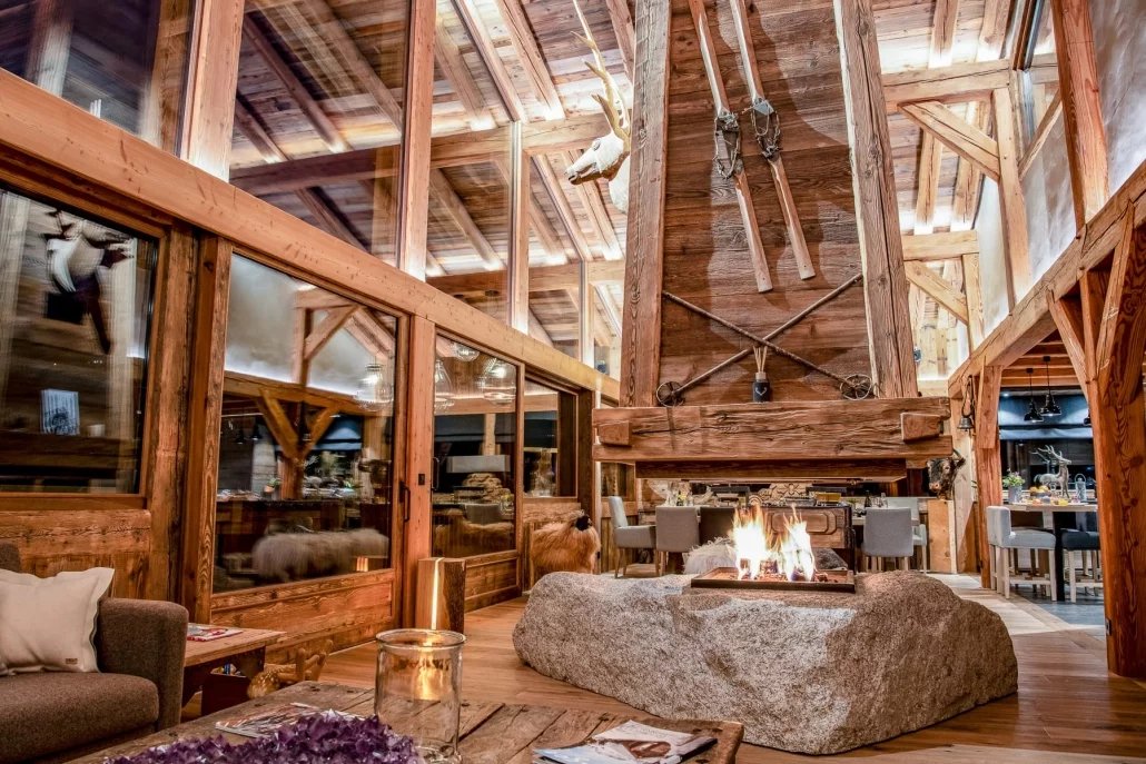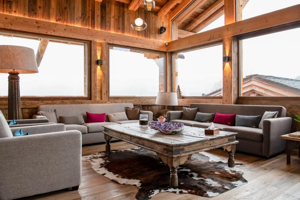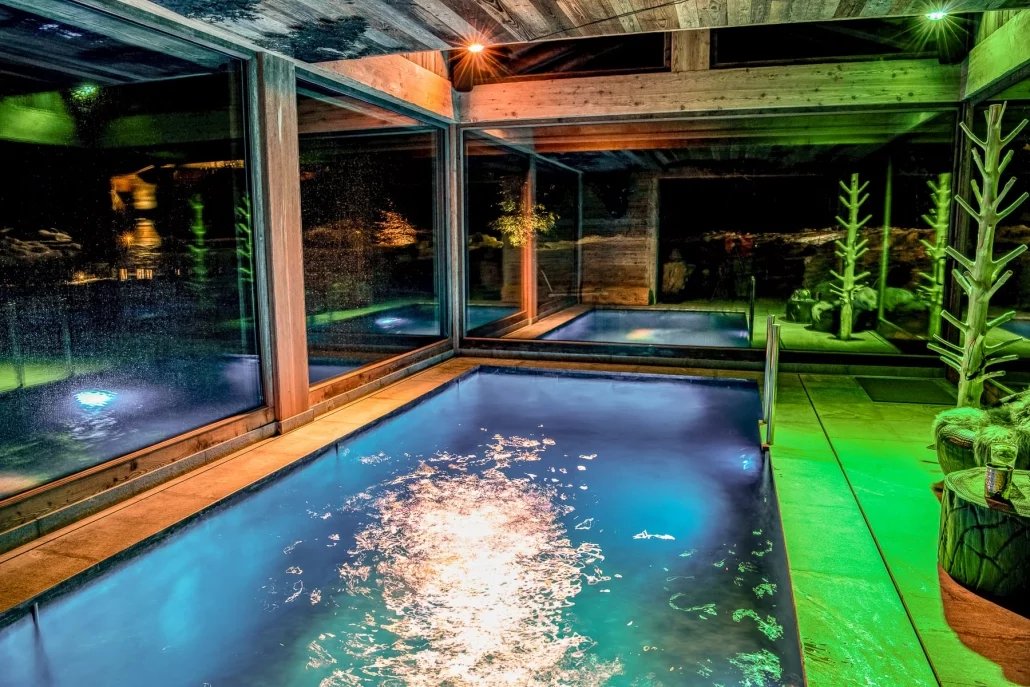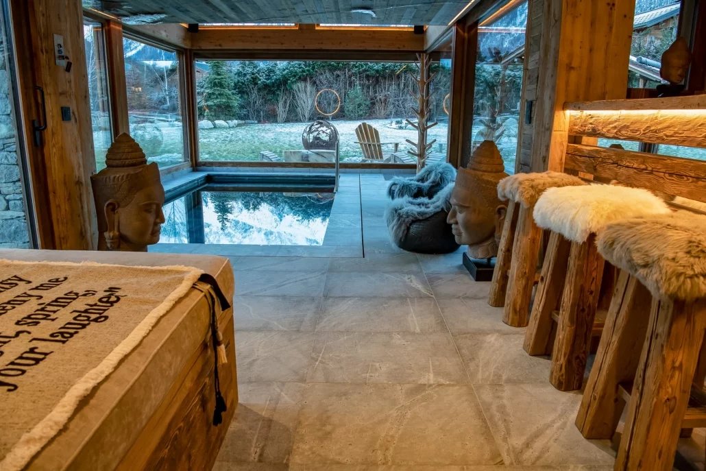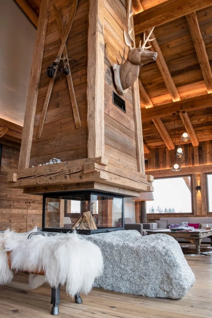 The chalet features a private pool, a gym, a sauna, and a steam room. The living room, with its 5-meter ceiling height, creates a warm and welcoming atmosphere.