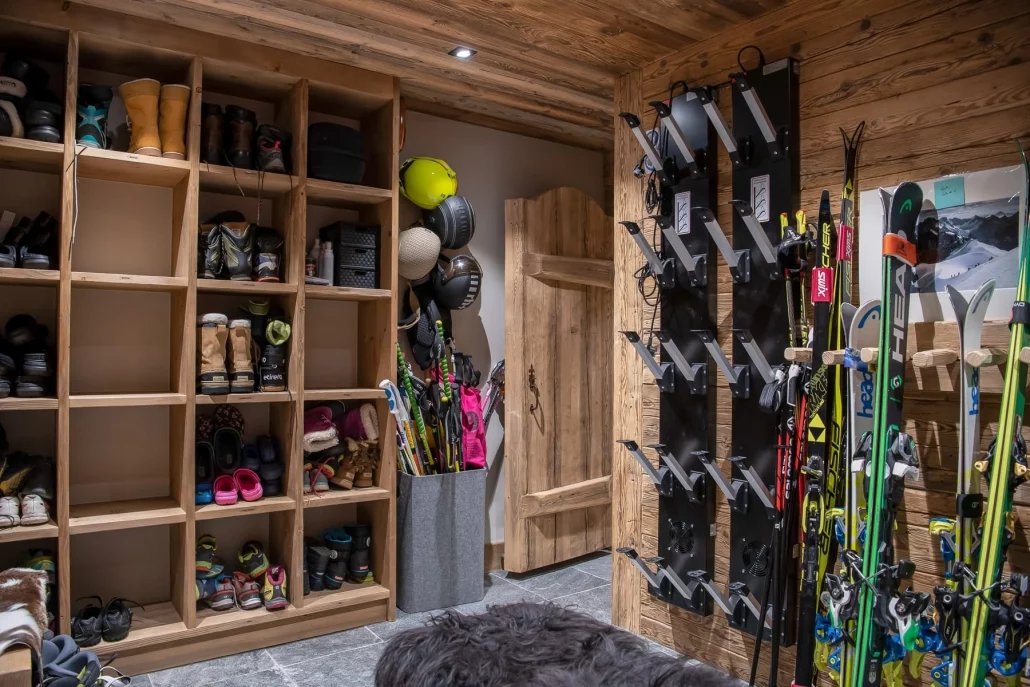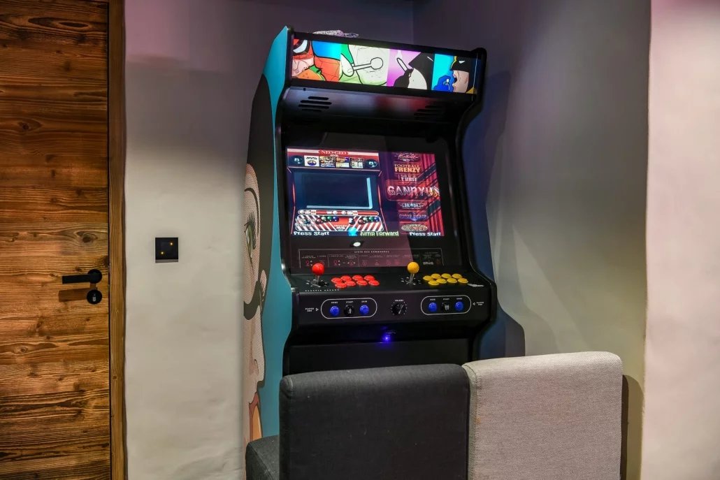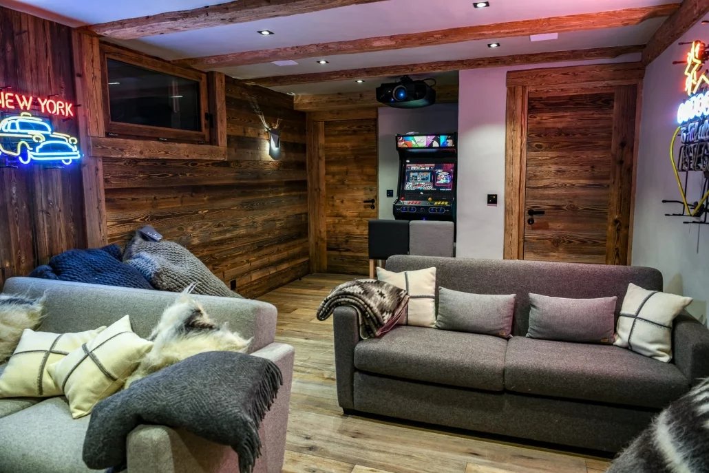 Modern amenities include a flat-screen entertainment system, Netflix, and an immersive cinema room with arcade games. A ski room is also available for easy storage.