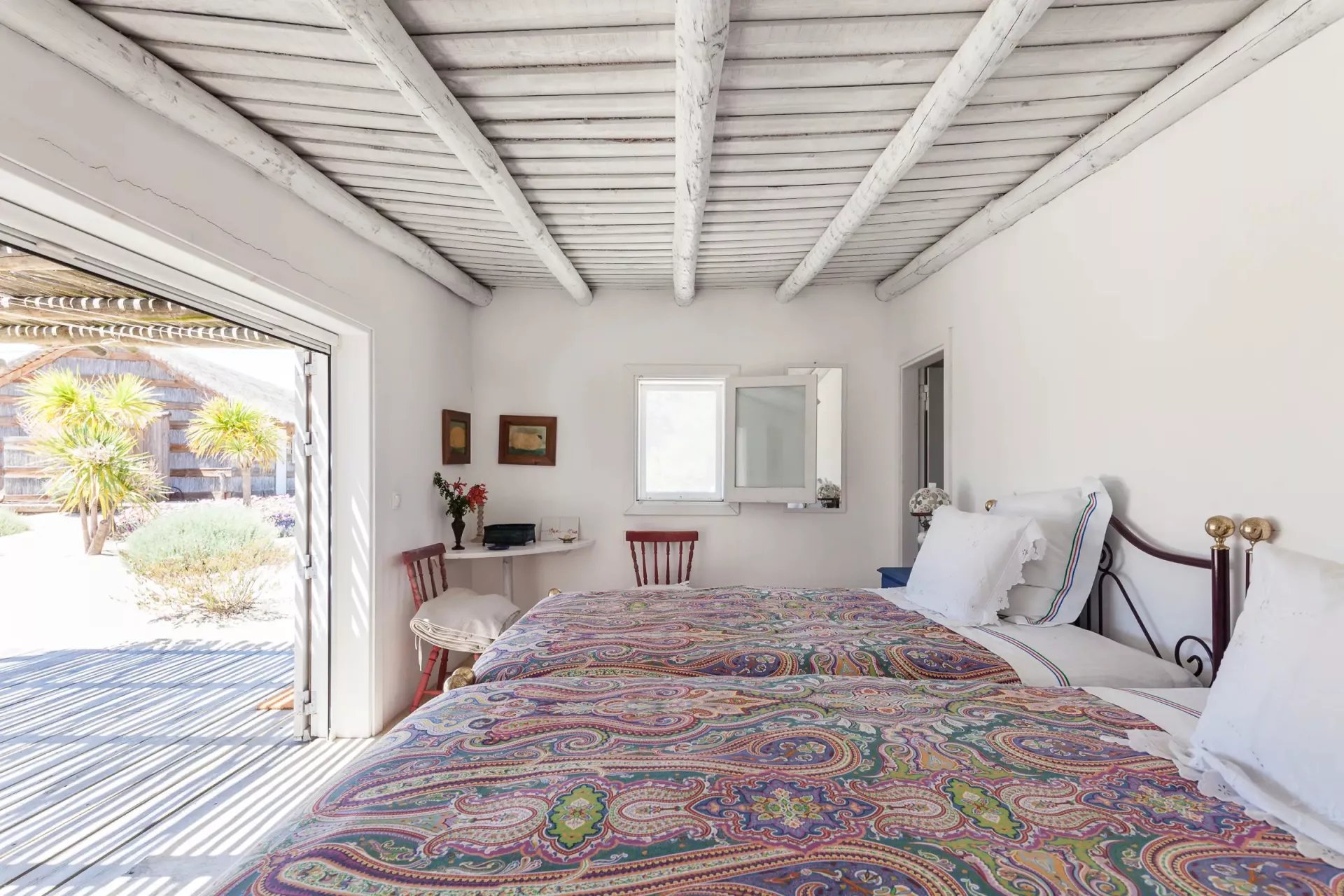 La casa cuenta con paredes encaladas, marcos de ventanas de color azul marino y un techo de paja, rodeado de amplias zonas de estar al aire libre y hermosas terrazas de madera. Situado en el pintoresco barrio de Carrasqueira, cerca del mar, ofrece un ambiente cálido y acogedor.