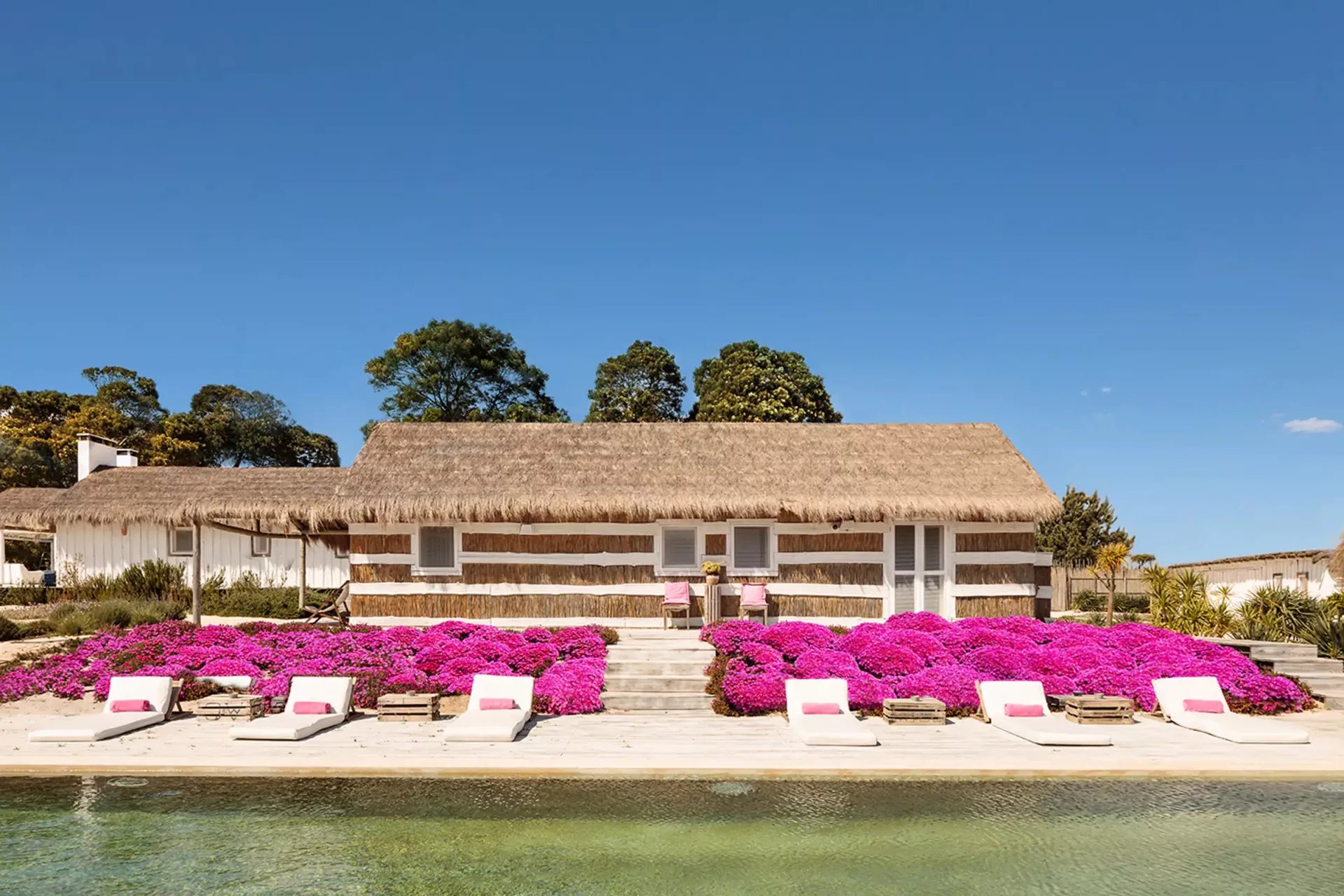La piscina principal está rodeada de flores fucsias y tumbonas, mientras que una segunda piscina, más pequeña, ofrece un espacio tranquilo para relajarse. Numerosos espacios al aire libre con lujosas camas y opciones para comer garantizarán privacidad y comodidad.