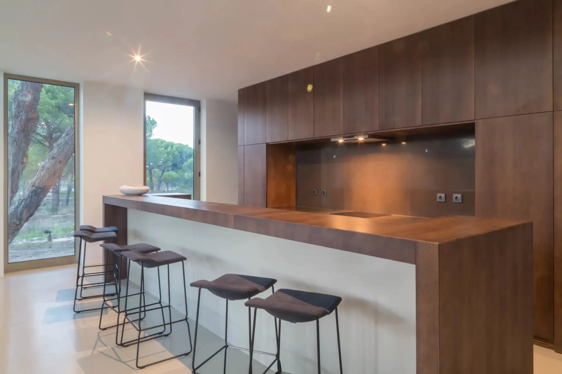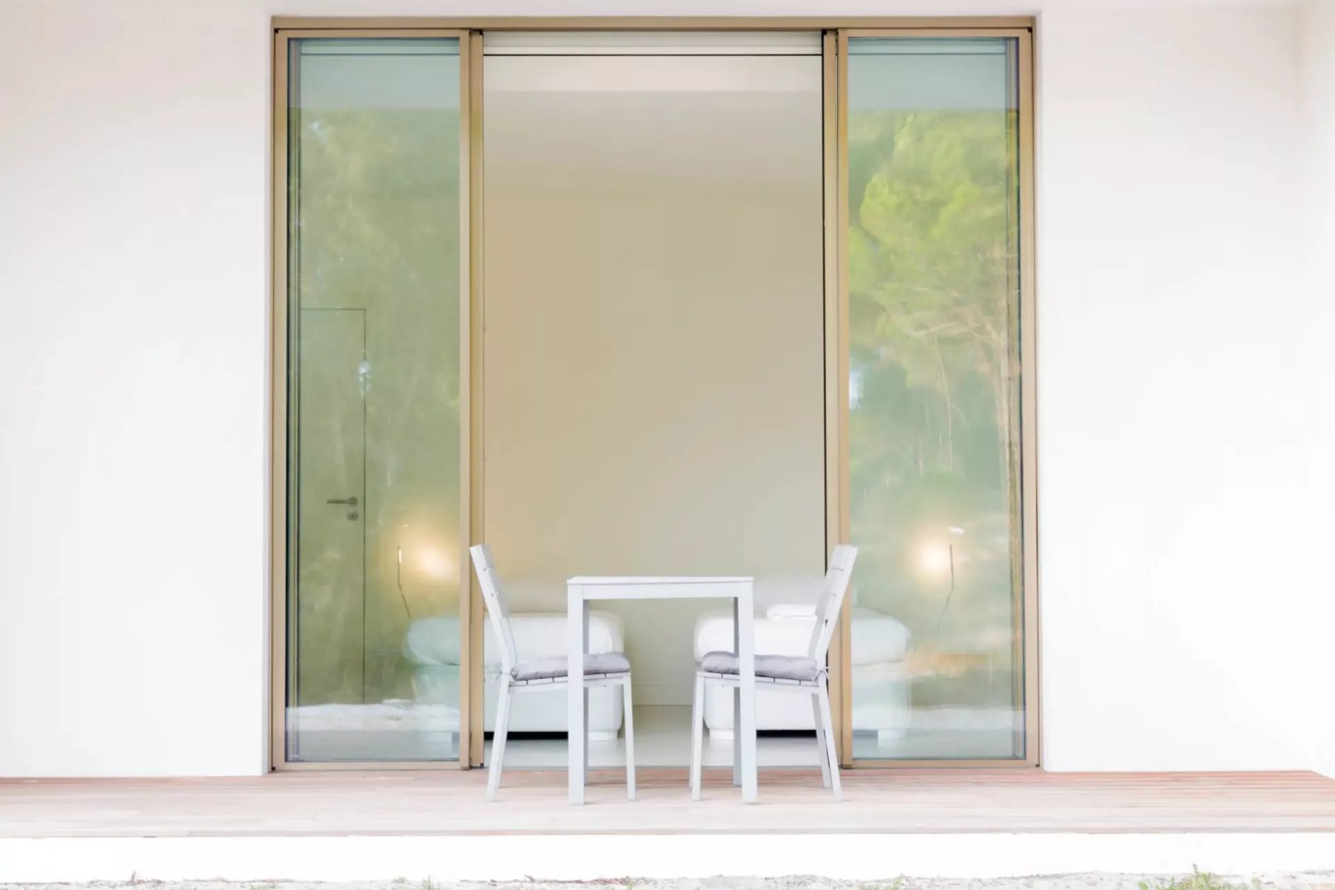 Au cœur de la villa, un salon à double hauteur, doté de grandes fenêtres, offre une vue imprenable sur le paysage naturel environnant, isolé par des pinèdes et des oliviers.