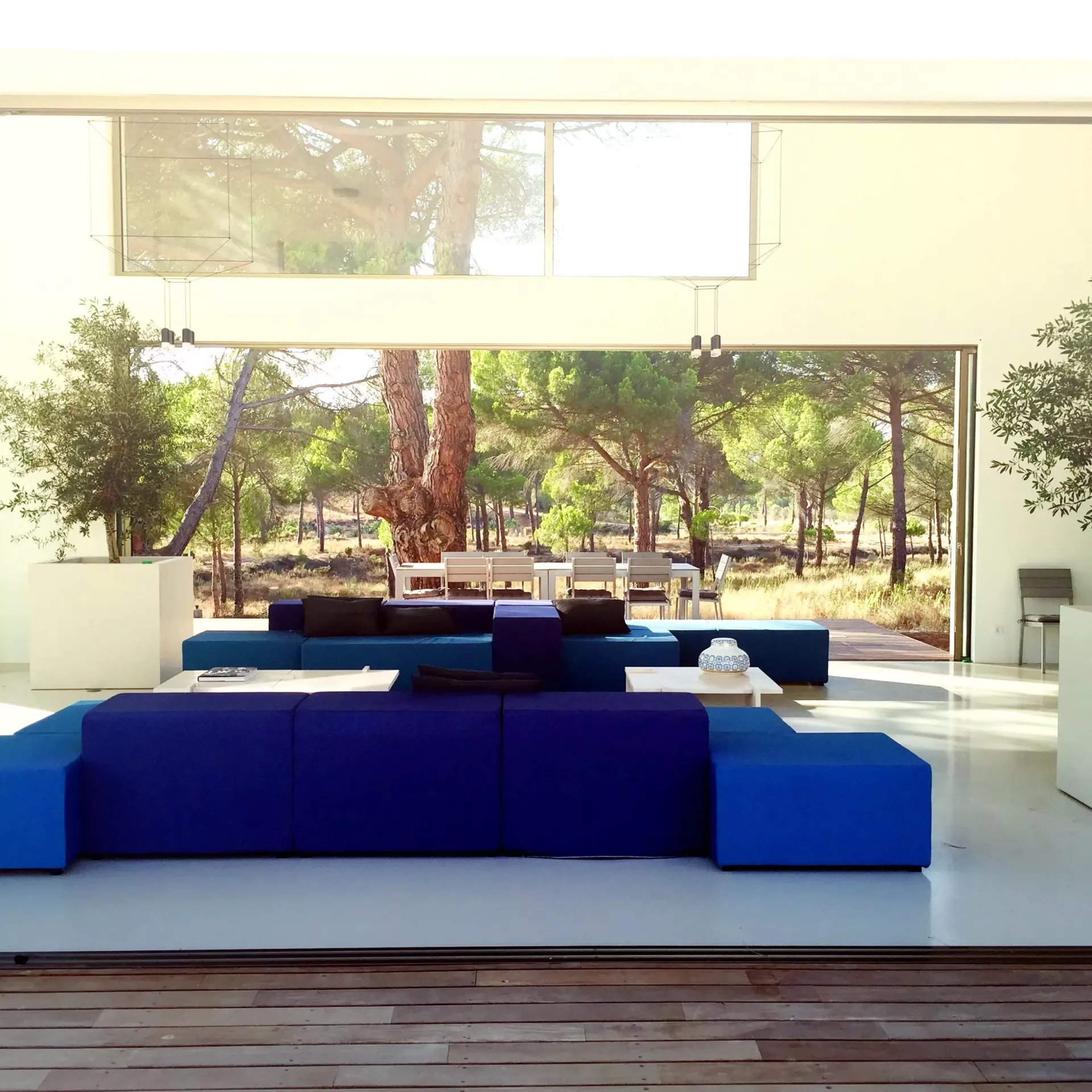 Les terrasses audacieuses et les grandes baies vitrées apportent une touche moderne à cette villa géométrique, à seulement quelques minutes de la plage. L'escalier central traverse plusieurs niveaux, et la plupart des pièces s'ouvrent sur des terrasses extérieures donnant sur la piscine. Les espaces de vie extérieurs sont conçus pour le confort, avec cheminées ou salons intégrés, et sont reliés par des passerelles en bois menant à un court de tennis et à un bac à sable isolé.