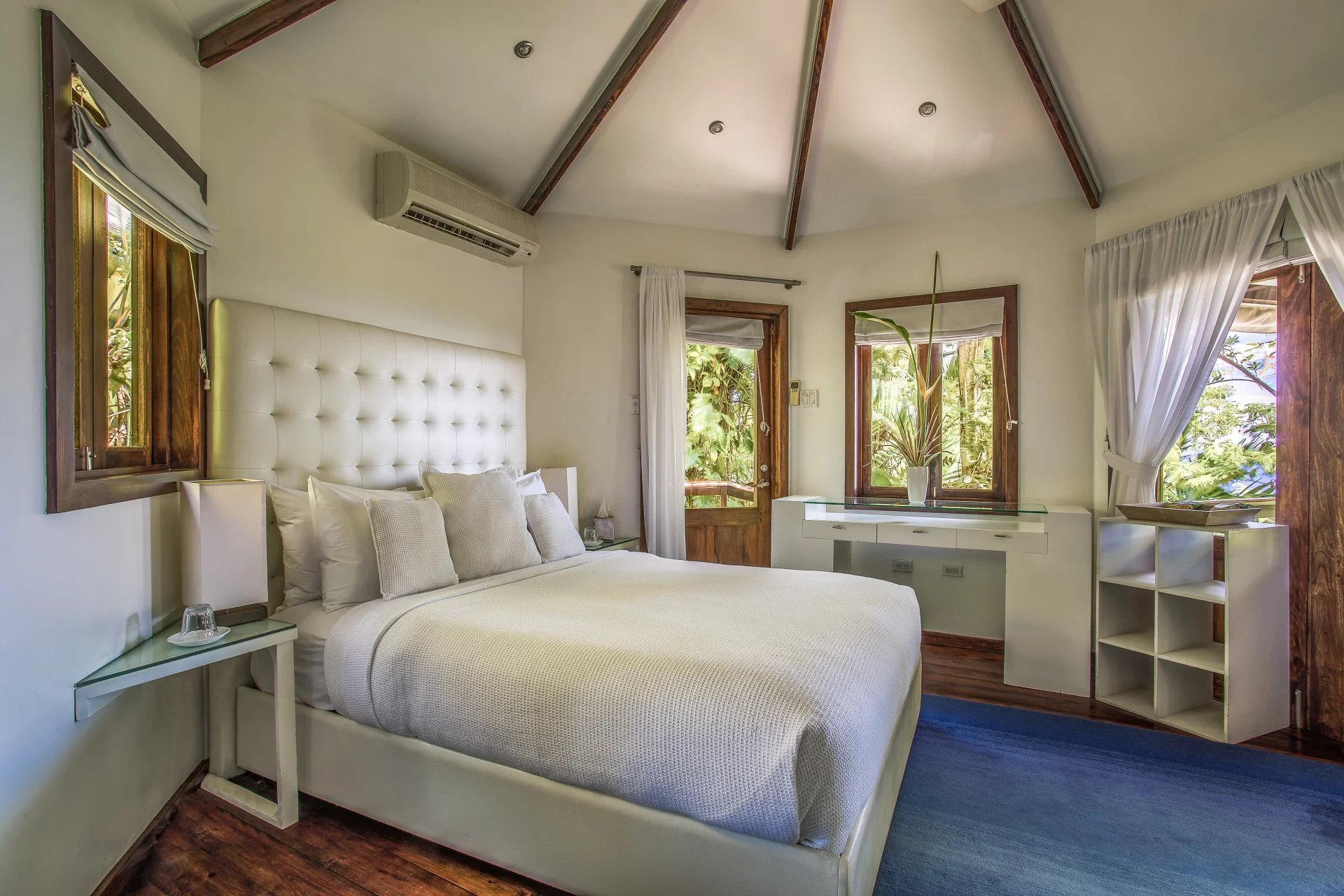 La cabane offre un cadre front de mer avec un balcon, un porche et un salon extérieur pour profiter de la vue. Vous pourrez également profiter d'un home cinéma, d'un minibar, du Wifi et de la climatisation. Le jardin est agrémenté de transats, d'une hamac et de mobilier de jardin, et vous aurez un accès privé à la plage.